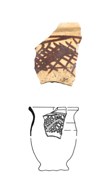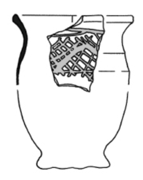 | 5c decoratie | donkerrode beschildering op schouder: rasterpatroon tussen twee horizontale lijnen |