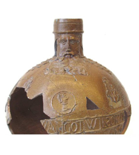 | 5c decoratie | baardmankop op hals, op buik tekstband WAN GOT WIL SO IST MEIN ZIL en bladmotieven en medaillons met manshoofd |