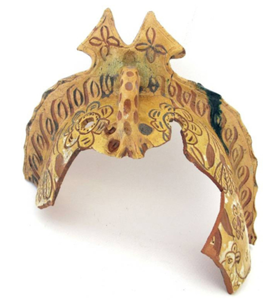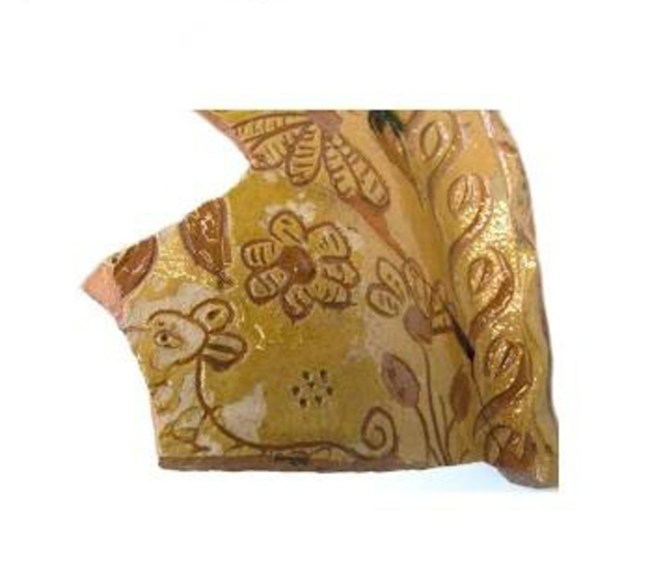 | 5c | witte sliblaag, Decorateur A1 (c. 1585-1602) : kap strikvormige bekroning, sgraffito florale motieven en dier (naast wapenschild?) determinatie S. Venhuis |
