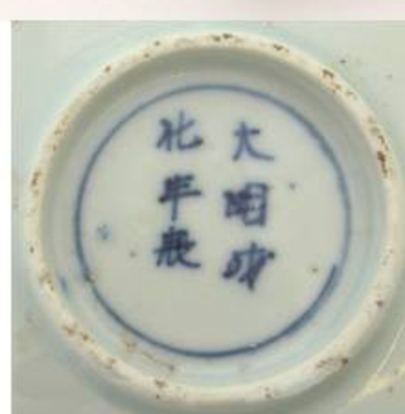 | 5c | Kangxi: op spiegel: vaas met bloementak binnen cirkel; onderzijde: zesmerk Ming-keizer Chenghua (1465-1487) binnen cirkel onderglazuur blauw |