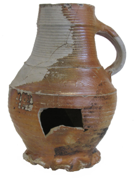 | 5d diversen | gesleten op ribbels en standring; het zoutglazuur heeft niet gehecht op deel van hals en schouder, deuk en aanbaksel op de buik |