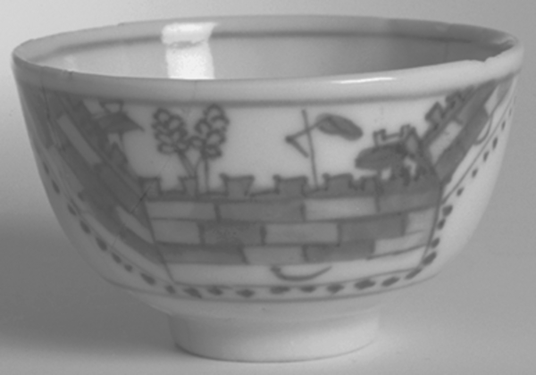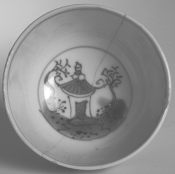 | 5c decoratie | inwendig: blauwe beschildering: pagode; uitwendig: blauwe beschildering: landschap met muur blauw |