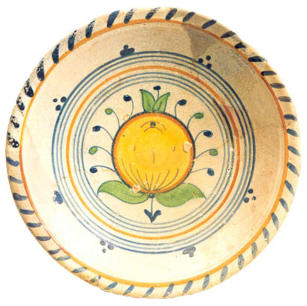 | 5c decoratie | beschilderd in geel, oker, groen en blauw op wit, spiegel: appel in concentrische cirkels; kabelrand inwendig: polychroom |