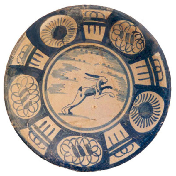 | 5c decoratie | beschilderd in blauw op wit, spiegel: springende haas binnen concentrische cirkels, vlag: imitatie Chinese Wan-Li motieven binnen blauw ingekleurde omlijsting inwendig: blauw |