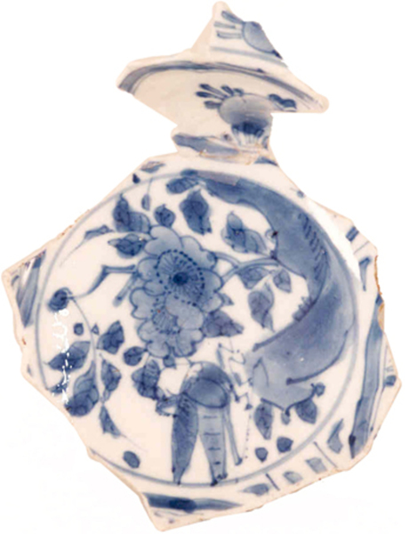 | 5c | blauw op wit beschilderd, binnen op de bodem een krekel in landschap, binnenwand vakindeling (grotendeels afwezig) onderglazuur blauw |