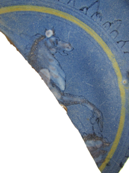| 5c decoratie | beschilderd in geel , wit en donkerblauw op blauw, imitatie berettino; spiegel: (voorste deel van een )paard binnen gele cirkel en geometrisch fries, vlag: rozetvormige knobbels in reliëf inwendig: polychroom |