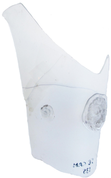 | 5d | identiek aan leeuwenmasker in productieafval glashuis Soop te Amsterdam uit 1601-1625 (Hulst publ. in voorbereiding type leeuwenmasker 2) |