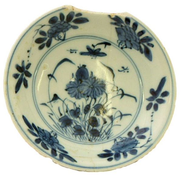 | 5c | Qianlong-stijl; spiegel: bloemen met insecten binnen cirkels, vlag: bloem-motieven, onderop de bodem een boeddhistisch symbool onderglazuur blauw, uitwendig bruin |