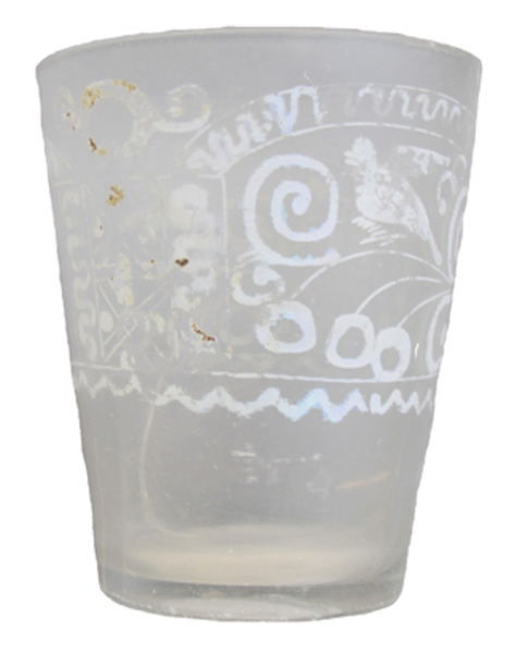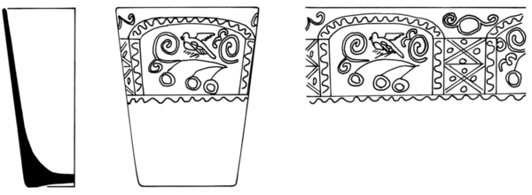 | 4b vorm | dikwandige conische beker, ook met radgravure, verdikte bodem, standvlak met (eventueel weggeslepen) pontilmerk |