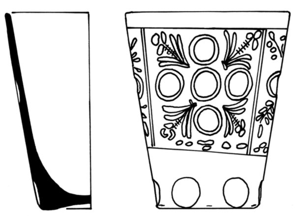 | 4b vorm | dikwandige conische beker, ook met radgravure, verdikte bodem, standvlak met (eventueel weggeslepen) pontilmerk |