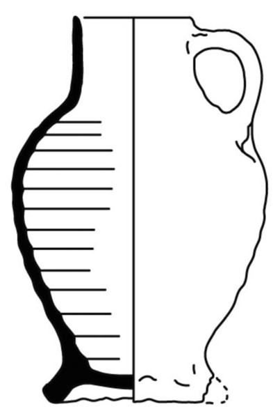| 4b | peervormige kan met schouder met knik overgaand in hals met rechte rand, standring |