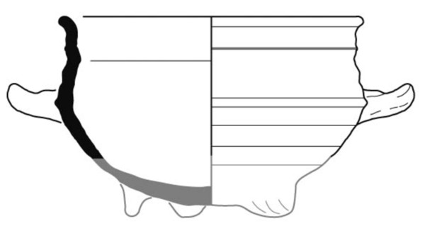 | 4b vorm | kom met scherpe knik bodem wand en rechte wand met een of meerdere ribbels, aan bovenzijde afgeplatte rand, lobvoeten |
