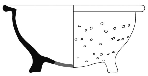 | 4b | bol vergiet met korte uitstaande rand en ingesnoerde hals, verdikte afgeronde rand, drie poten |