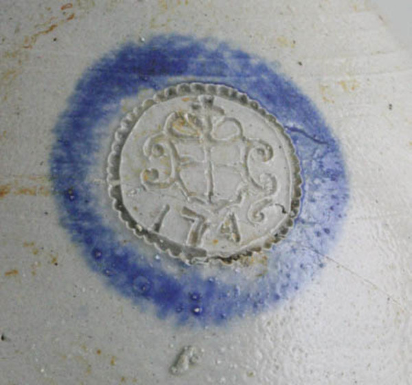 | 5c decoratie | op buik: kobaltblauwe cirkel rondom stempel met wapen en jaartal 1746 (Selters bron - Trier) blauw |