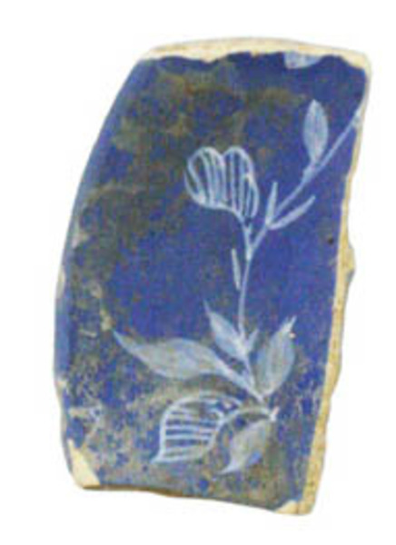 | 5c decoratie | witte beschildering op blauwe ondergrond: wit floraal motief op een blauw fond blauw |