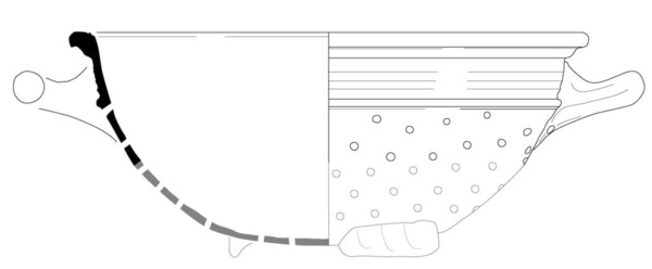 | 4b | vergiet met scherpe knik bodem-wand en rechte wand met een of meerdere ribbels, naar buiten geknikte platte rand, lobvoeten |