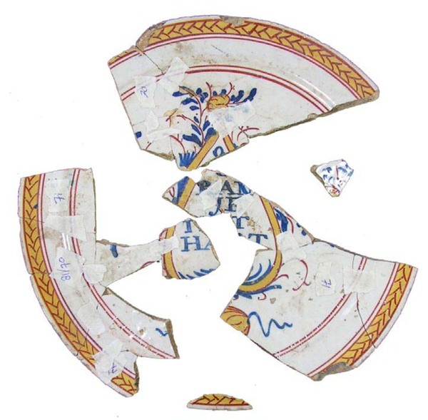 | 5c | decoratie in geel en blauw (onderglazuur) en bruin-rood, bovenglazuur, spiegel: ruit met spreuk: (.RAN JE I...T HA.T; oranje in het hart), bladranken, concentrische cirkels, vlag: concentrische cirkels, kabelrandje polychroom |
