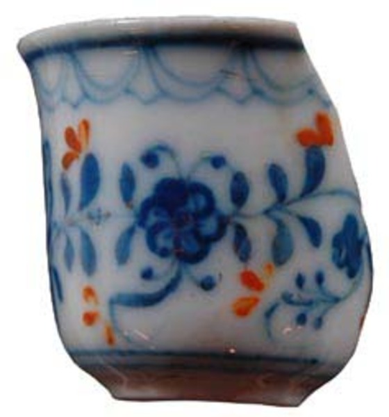 | 5c decoratie | wand binnen: cirkel, wand buiten: cirkel, boogjesrand, floraal motief, vogeltje, concentrische cirkels onderglazuur blauw en oranje, bovenglazuur goud |