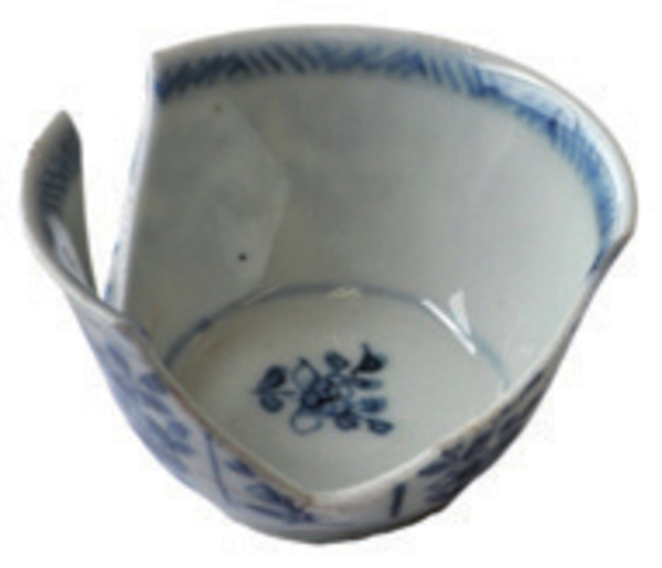| 5c decoratie | uitwendig: bloemen in panelen onderglazuur blauw |