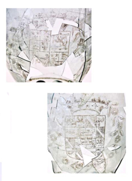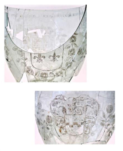 | 5c | 4 rijen van 8 horizontale puntnoppen op de schacht; cuppa gegraveerd met 4 wapenschilden omgeven door bloemranken en onder de lip een tekstband: "Desen Roomer Redelyck Groot Cammen Syn Asem In Ver...."en "....sult DVS TE BETALEN"; De wapens zijn van de Engelse koningin, prins Maurits, de Franse Koning en het wapen van Buren |