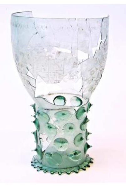 | 4b | roemer met eivormige cuppa , draad op de overgang naar de schacht en twee of meer verspringende rijen puntnoppen, opgestoken bodem met pontilmerk, geknepen voetring |