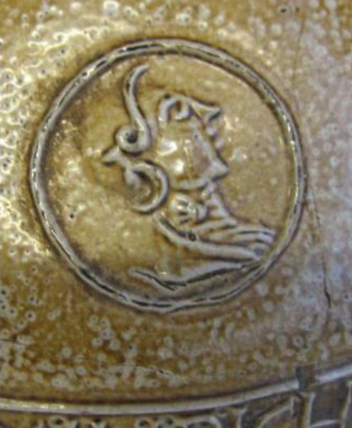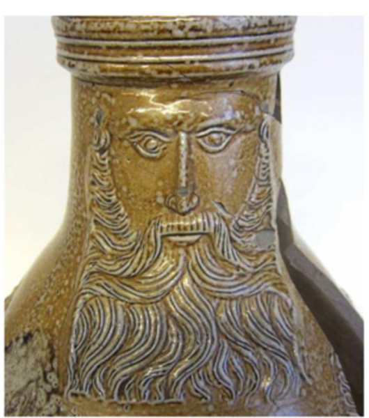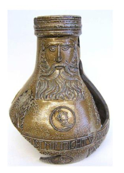 | 5c | bruin gespikkeld met appliques: op de hals baardman met rechthoekige baard; op de schouder en buik medaillons met manshoofd met kap afgewisseld met eikenbladeren; op buik fries met tekstband: ARM VND FRVM IST MIN RICHTYM baardmankan |