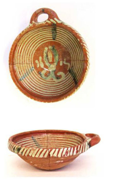 | 5c decoratie | gele slib met groene glazuur vlekken, inwendig: gestileerde tulp (?) binnen concentrische cirkels en jaartal 1615; buitenzijde: rand schuin gestreept |