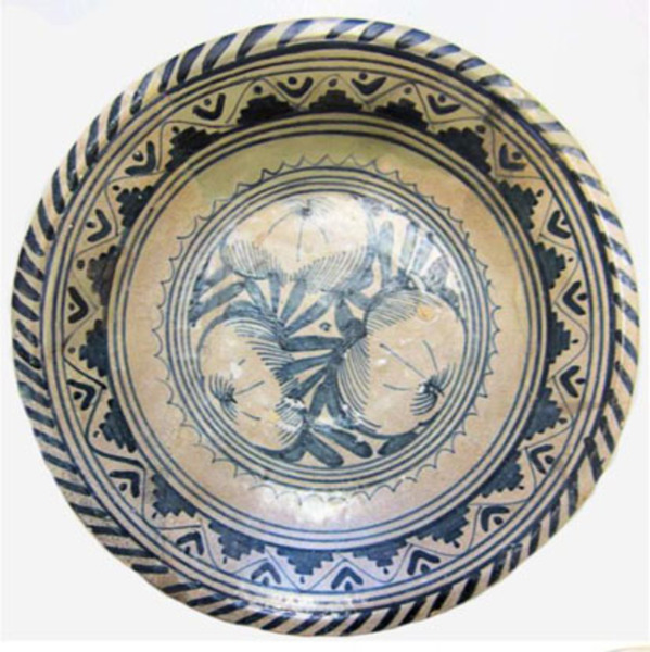 | 5c decoratie | blauw op wit beschilderd: granaatappels binnen concentrische cirkels, vlag met fries, kabelrand inwendig: blauw |