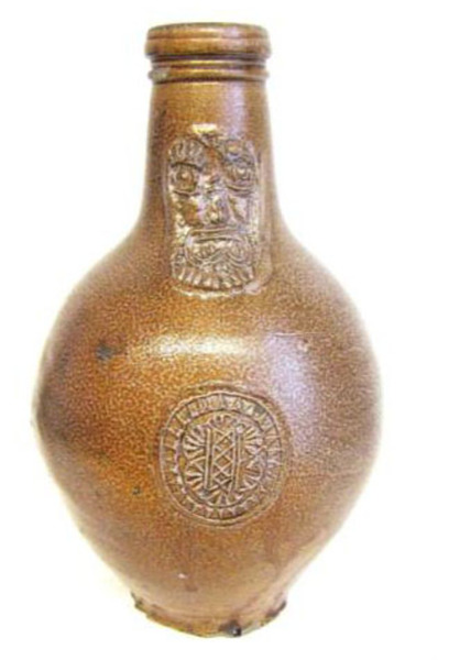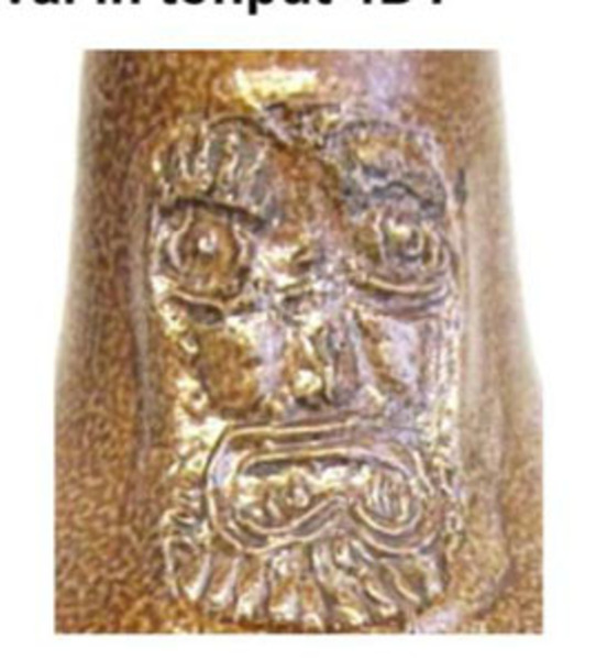 | 5c decoratie | bruin gespikkeld, grove grijnzende baardman-applique op hals, fantasiewapen met 4 kruisen op de buik staart bij ooraanzet |