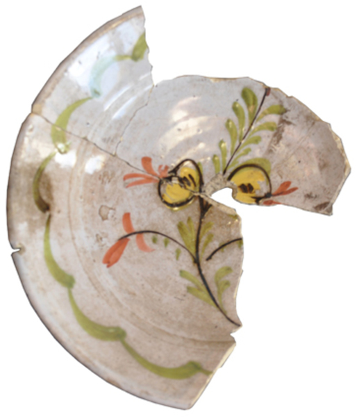 | 5c decoratie | spiegel: bloemtak in geel, paars en groen; vlag: groene haaltjes polychroom |