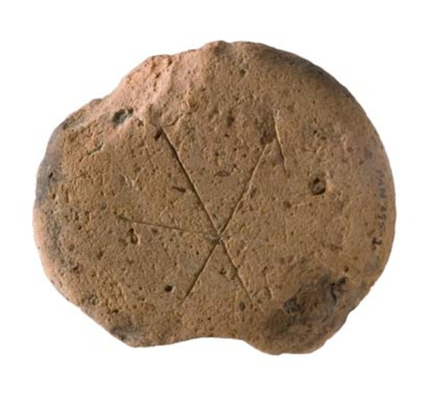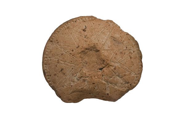 | 5c decoratie | inkrassingen; bovenzijde: twee dubbele, vijfpuntige sterren over elkaar heen, binnen een cirkel, daaromheen een rij spatelindrukjes; onderzijde: ster van drie elkaar in het midden kruisende lijnen |