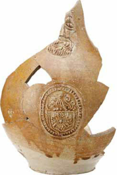 | 5c decoratie | appliques: baardmanmasker op de hals, wapen met leeuw en pijlen op de buik |