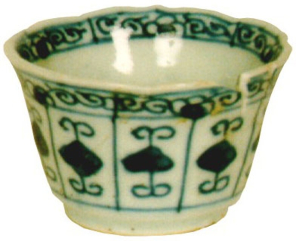 | 5c decoratie | inwendig op bodem: bloemperk; uitwendig: vakverdeling met gestileerde bloemen onderglazuur blauw |