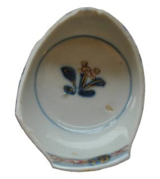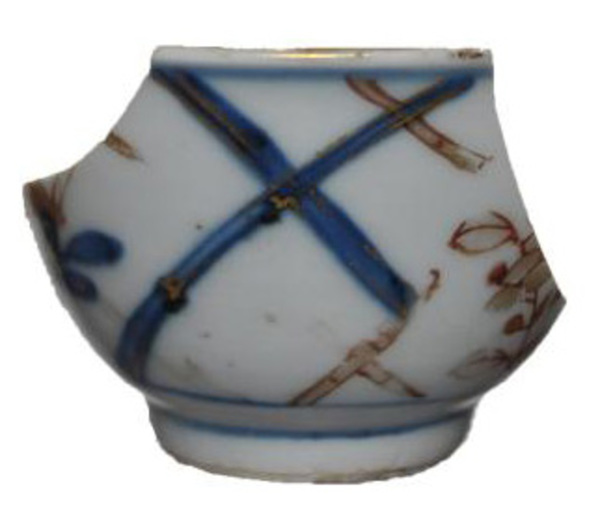 | 5c | planten en diagonale strepen op de buitenzijde, aan de binnenzijde servetwerk, op de spiegel een bloem decor in Chinees Imari; Kangxi-periode onderglazuur blauw, bovenglazuur rood en goud |