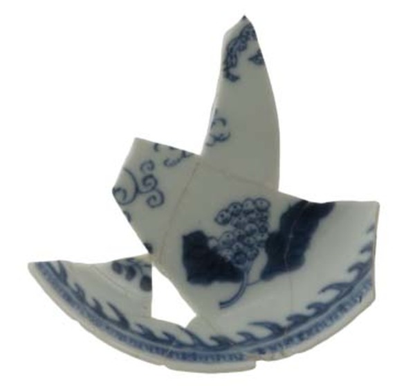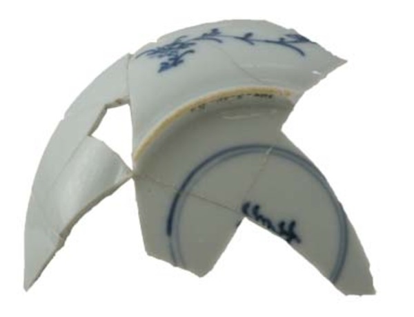 | 5c | spiegel: te gering voor beschrijving; vlag: een geometrisch- met daaronder een haaientanden filet, uitwendig: vlag: bloemenrank, bodem: bloem binnen een cirkel onderglazuur blauw |