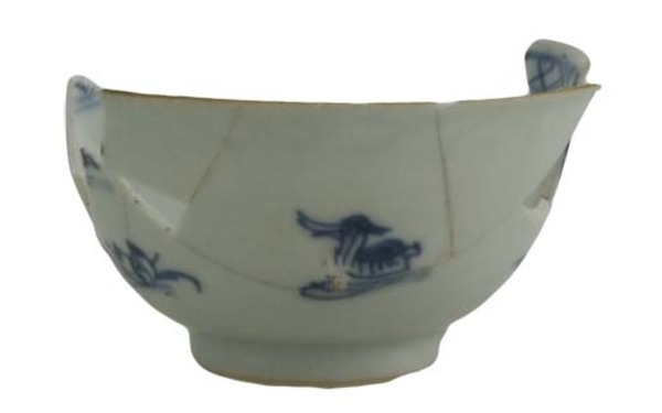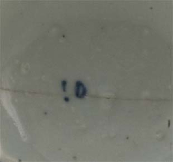 | 5c | inw: onder randservetwerk, op bodem een 0 en een I of uitroepteken; uitw: eend, bonsaiboom en lotus, vierde afbeelding ontbreekt; bruine rand onderglazuur blauw, bruin |
