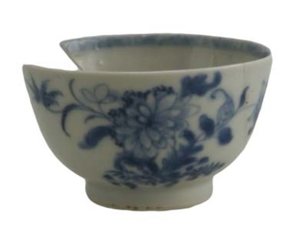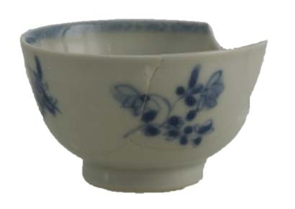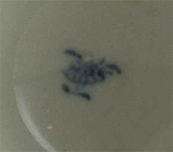 | 5c decoratie | inw: onder rand serverwerk, op bodem bloem; uitw: een groot en twee kleine bloementuiltjes onderglazuur blauw |