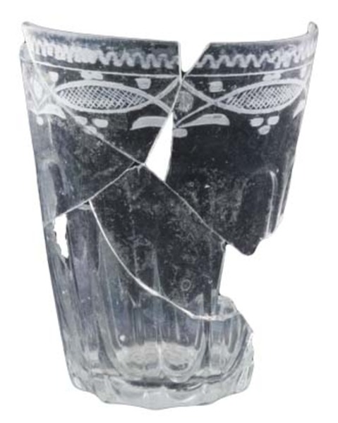 | 4b | dikwandige beker met vormgeblazen reliëf met verticale ribben, onderaan achtzijdig verdikte bodem met standvlak met (eventueel weggeslepen) pontilmerk |