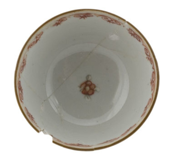 | 5c decoratie | uitw: vakken met florale motieven; inw: geometrische motieven onder rand, bloem op bodem bovenglazuur rood en goud |