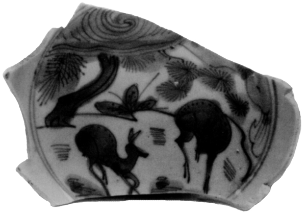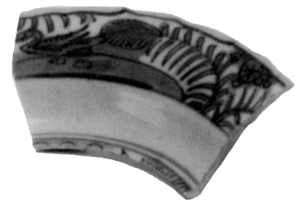 | 5c | vlak: onderglazuur blauw: inwendig: eenden en waterplaten; uitwendig: vogels op tak en bloeiende pruimentakken; spiegel: onderglazuur blauw: twee herten in landschap accoladerand inwendig: blauw |