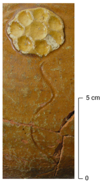 | 5c | applique in witbakkende klei: bloemrozet met ingekraste bloemsteel |