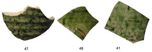 | 5d | 3 fragmenten, waarschijnlijk afkomstig van meerdere kannen (mogelijk s8-kan-1), 1 x misbaksel (glazuur over breukvlak), rode baksels glazuur Utrecht (Anthoniedijk) |