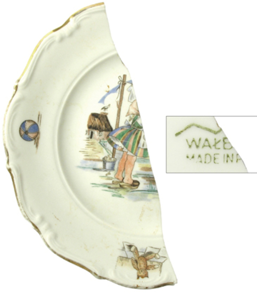 | 5c | transferprint op spiegel: meisje op klompen; op vlag: speelgoed (bal, teddybeer) en een gouden bies op de buitenzijde van de rand |