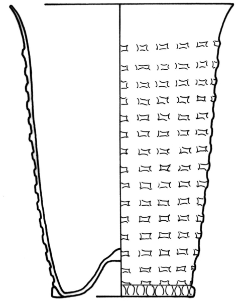 | 4b | cilindrische of licht conische beker met wafelpatroon, uitstaande lip, opgestoken bodem met pontilmerk, voetring |