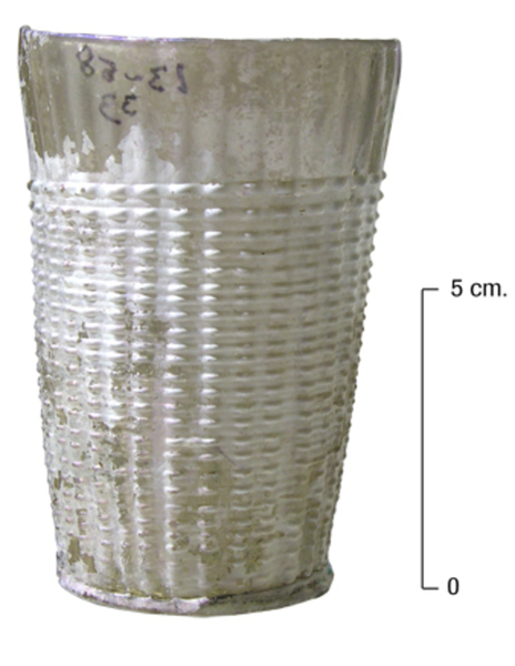 | 4b vorm | cilindrische of licht conische beker met wafelpatroon, rechte lip, opgestoken bodem met pontilmerk, voetring |