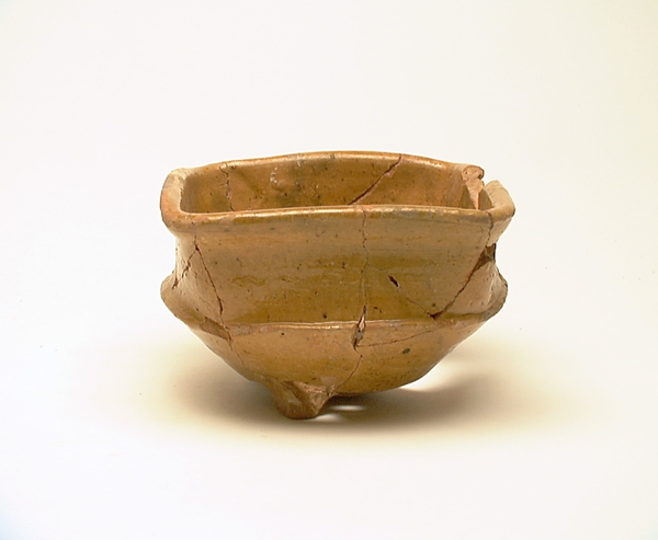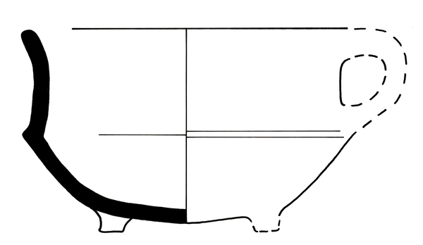 | 4b | vierkante vuurtest met scherpe knik bodem-wand en iets uitwijkende wand, afgeronde rand, poten |