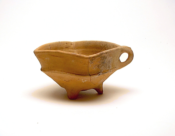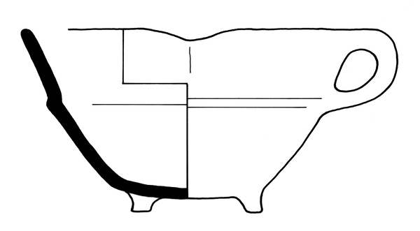 | 4b | vierkante vuurtest met scherpe knik bodem-wand en iets uitwijkende wand, afgeronde rand, poten |
