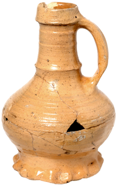 | 4b | bolle kan met afgeronde buikknik, schouder overgaand in hals, ribbels op schouder en hals, kraagrand, standring |