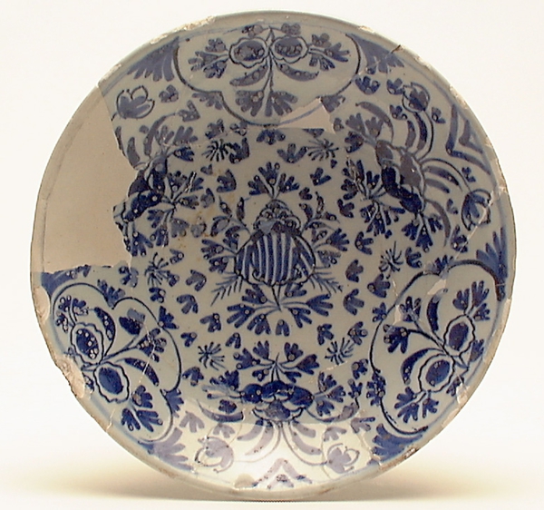 | 5d diversen | beeldmerk: De Paeuw merkteken pottenbakkerij "de Paeuw" (1705 - 1740). Het cijfer 6 onder het merkteken geeft aan dat dit bord thuis hoort in een serie van 6 of 12 stuks |