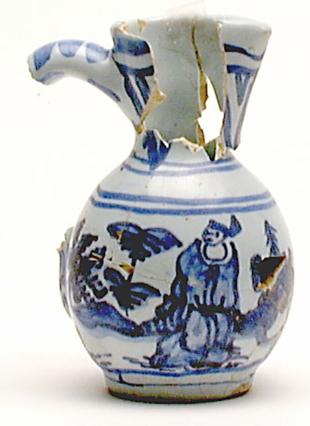 | 5c decoratie | uitwendig: buitenzijde hals en oor slordig geometrisch patroon, buik landschap met chinees persoon inwendig: blauw |